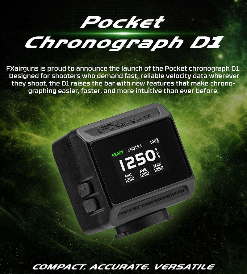 Ten chronometr stanowi ulepszenie modelu FX Pocket Chrono V2, w którym jedna różnica jest natychmiast widoczna. Model D1 jest wyposażony w wyświetlacz, co oznacza, że do pomiaru prędkości strzału potrzebny jest tylko sam chronometr. Eliminuje to konieczność korzystania z oddzielnego wyświetlacza lub smartfona do wyświetlania statystyk strzałów. Prędkość jest widoczna na pierwszy rzut oka, do imponujących 1250 fps. Oferuje również możliwość podglądu pełnych statystyk serii strzałów.