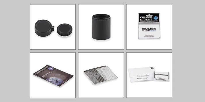 W zestawie: luneta, osłona przeciwsłoneczna, mocowanie (pierścienie), ściereczka, instrukcja