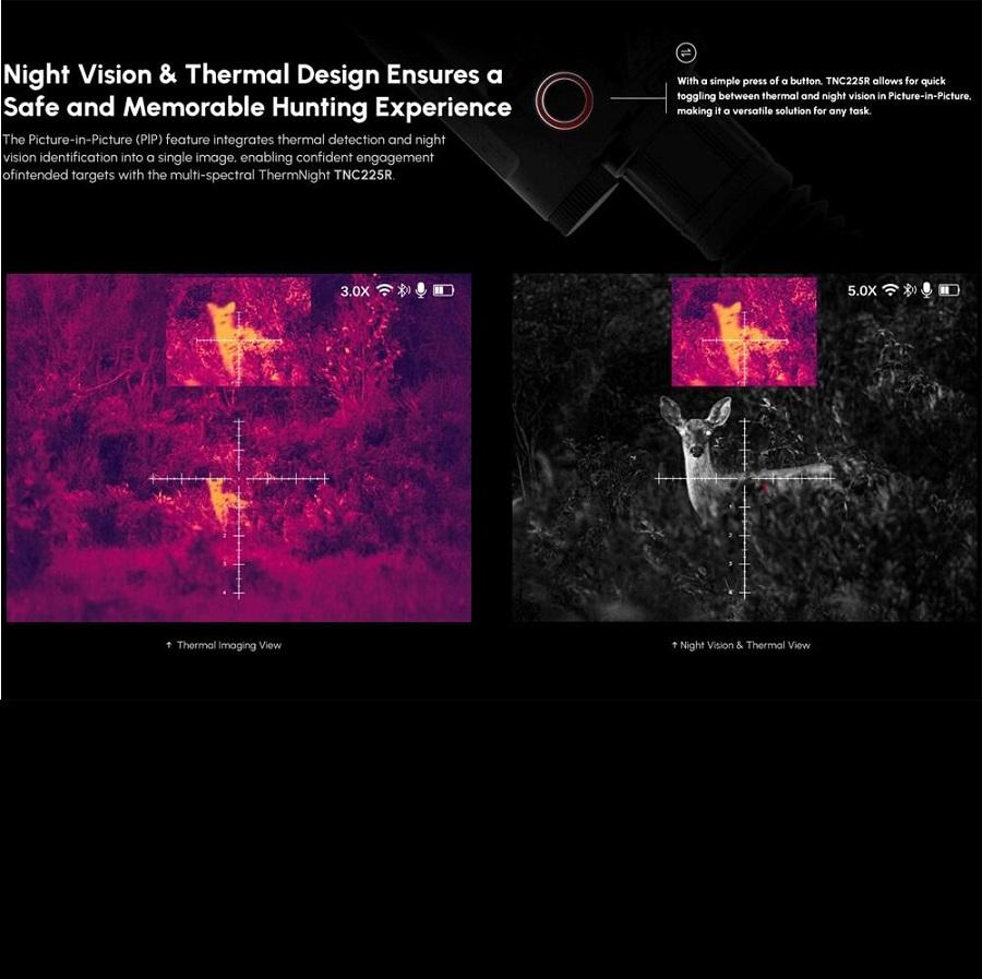 Multispektralna luneta celownicza DNT ThermNight Compact TNC225R zapewnia wszechstronność i możliwość szybkiego przełączania między trybami termowizyjnym, dziennym i noktowizyjnym. Aby szybko i precyzyjnie namierzyć cel, urządzenie posiada funkcję zerowania w trybie jednorazowym zarówno w kanale termowizyjnym, jak i w kanale dzienno-nocnym.
