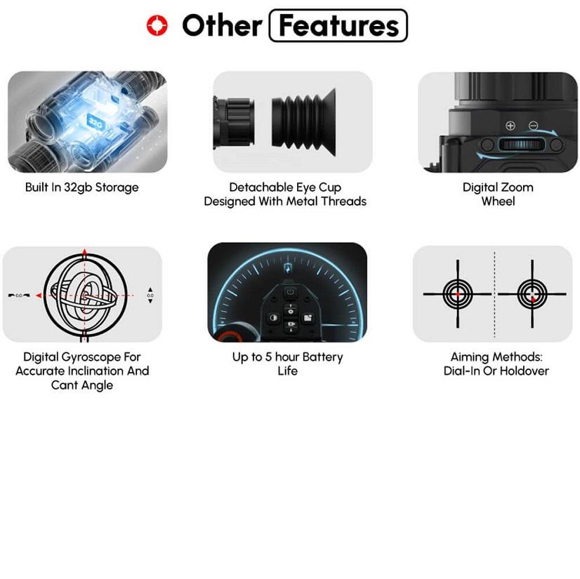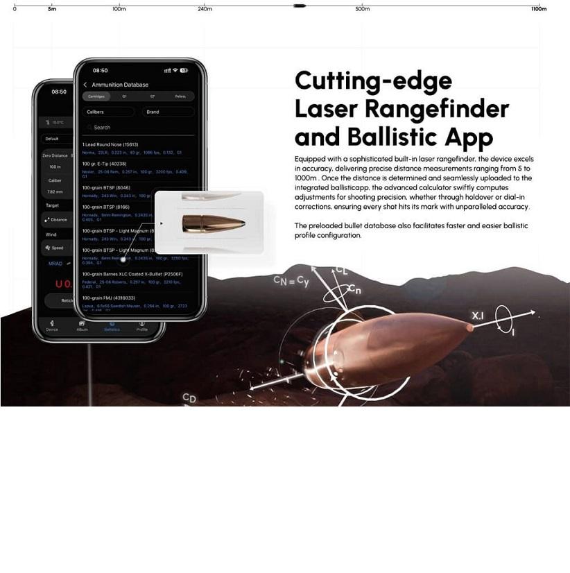 W zestawie znajduje się odłączany oświetlacz podczerwieni 850 nm, który można wymienić na oświetlacz 940 nm (dostępny osobno), aby dostosować go do własnych potrzeb. Wbudowany dalmierz laserowy (LRF) usprawnia strzelanie dzięki zaawansowanym obliczeniom balistycznym w połączeniu z aplikacją DNT.