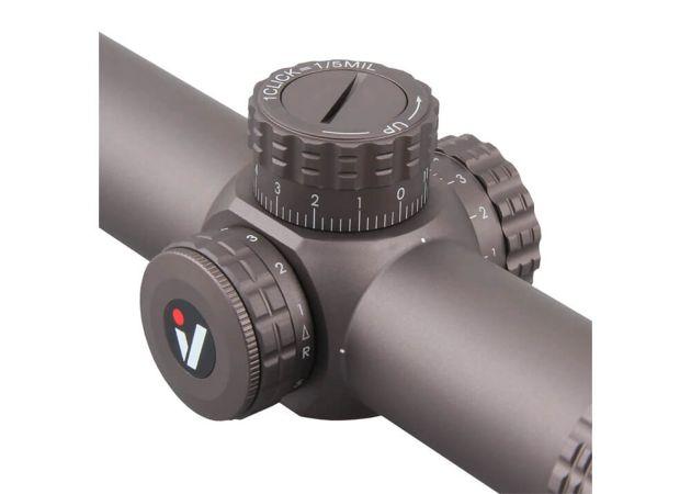 Po lewej stronie lunety VictOptics S6 1-6×24 VI-CTSIX Coyote FDE znajduje się wieżyczka, która umożliwia regulację jasności siatki celowniczej. Luneta posiada siatkę podświetlaną na czerwono i na zielono. Oba kolory mają pięć poziomów jasności, co oznacza, że siatka będzie zawsze wyraźnie widoczna. Niezależnie od warunków, w jakich będziesz strzelać, możesz wybrać między czerwoną a zieloną siatką.
