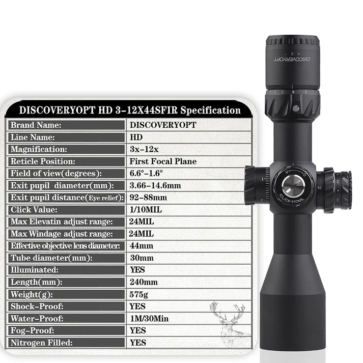 Luneta celownicza DiscoveryOpt HD 3-12X44 SFIR FFP + montaż