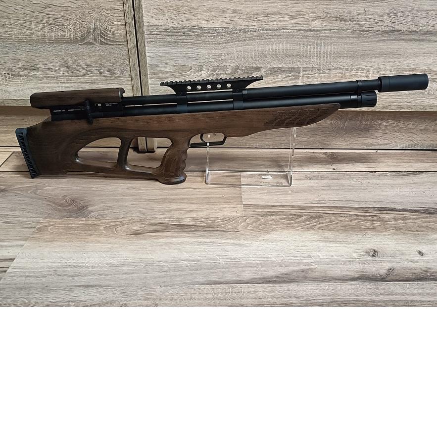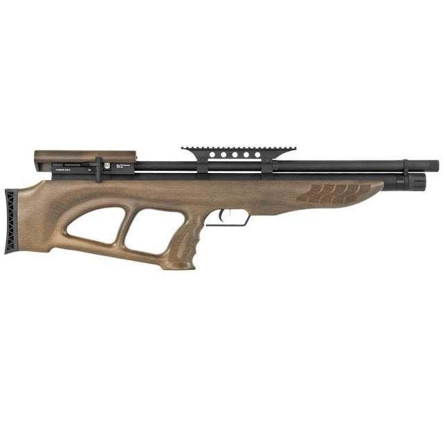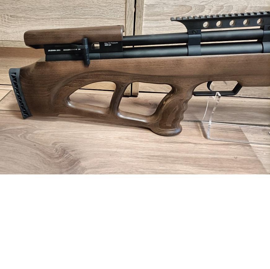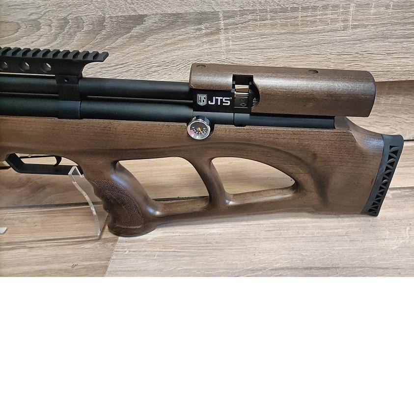 Ten karabin PCP JTS Brawn w układzie bullpup jest w całości wykonany z metalu i ma pięknie wykończoną drewnianą kolbę. Lufa ma długość 437 mm, a jego całkowita długość wynosi 838 mm. Brawn charakteryzuje się solidną konstrukcją i waży około 4220 gramów, co wynika z w pełni metalowej i drewnianej konstrukcji. Mimo to wiatrówka doskonale leży w dłoni.